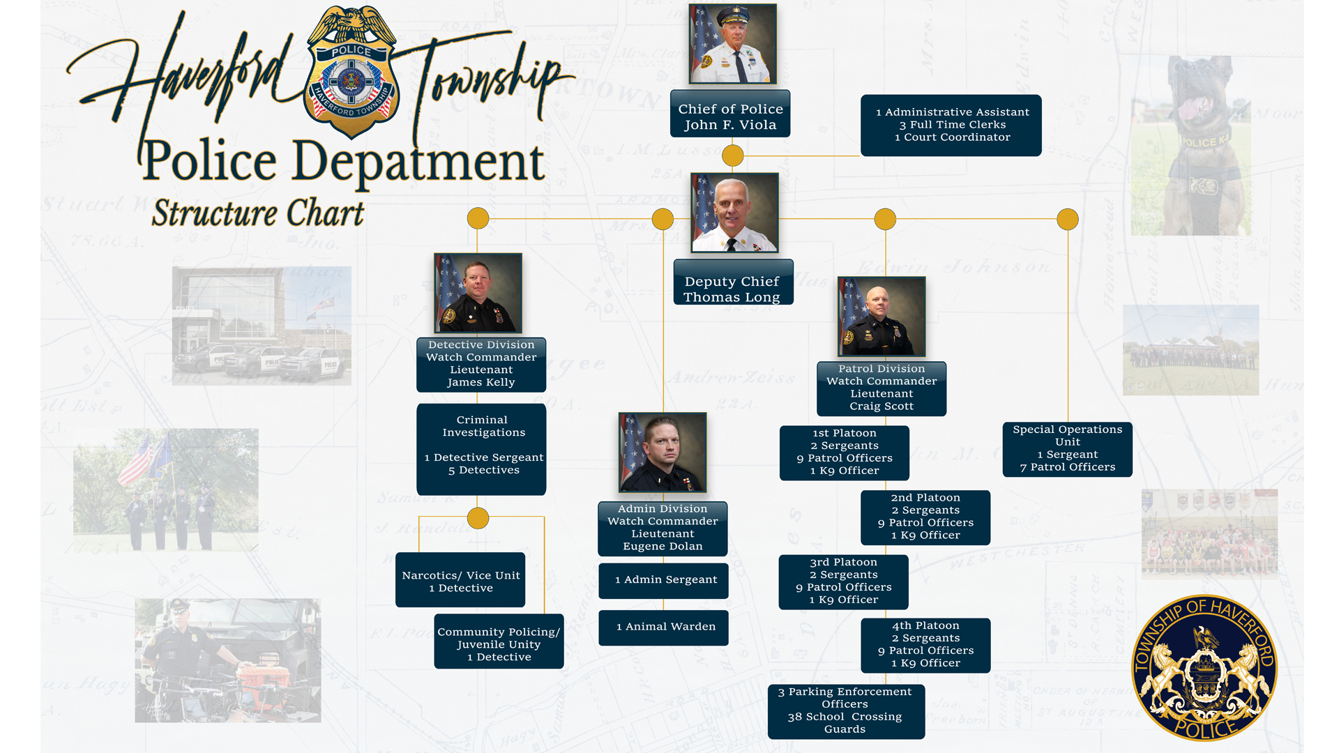 Patrol Division is the backbone of the Haverford Township Police Department. It is tasked with carrying out the basic functions of the police department. While every member of the department is sworn to protect life and property, prevent crime, and arrest violators of the law, it is the members of the patrol division that help to accomplish these goals through routine patrol of geographical areas, responding to emergency and non emergency calls for service, investigating traffic collisions, and the proper enforcement of all laws and ordinances in accordance with the rights and liberties guaranteed by the United States Constitution and the Constitution of the Commonwealth of Pennsylvania as well as handling other requests for police services. The patrol division is on duty twenty four hours a day, seven days a week and is staffed by 2 Lieutenants, 8 Sergeants, 36 police officers and 4 police K9s.
